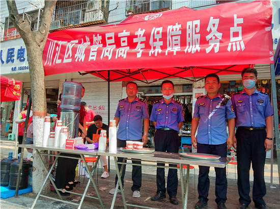 当日,记者在现场看到,虽然天气炎热,可是城管队员们却顾不上休息,他们不但要在服务点前和爱心商家的人员一起给考生提供饮用水服务,还要维持考点附近的秩序。