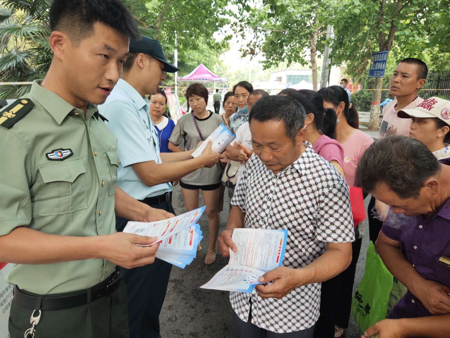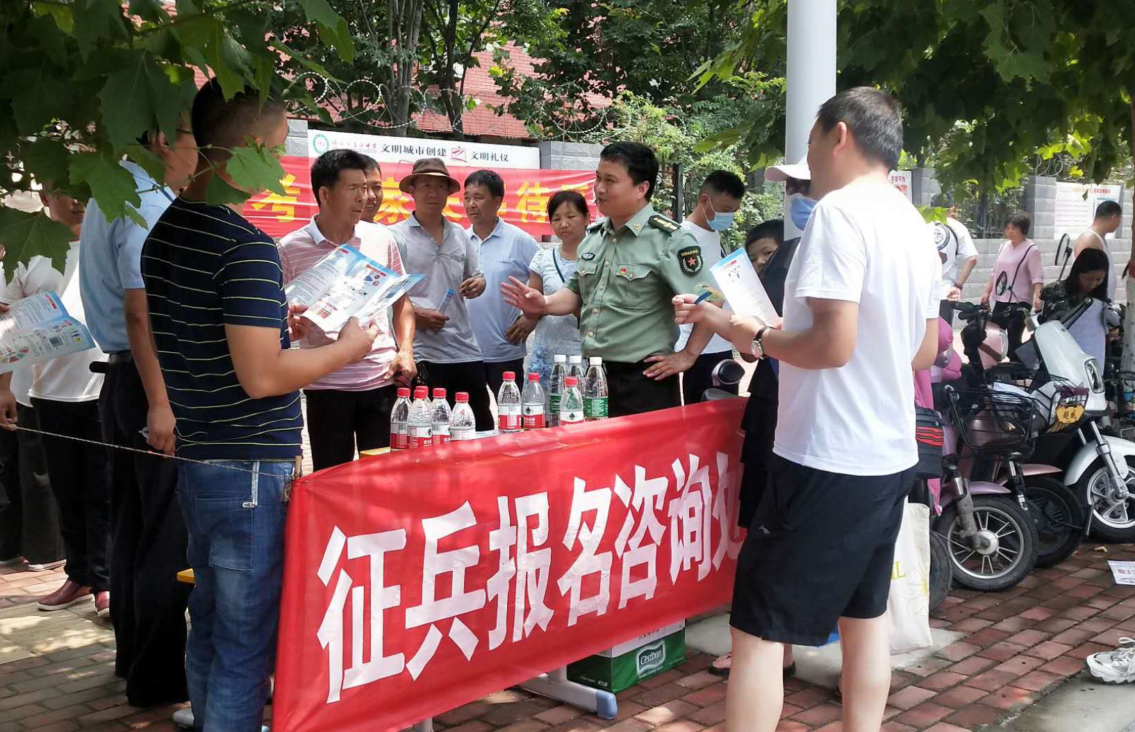 为强化全民依法履行兵役义务观念,激发广大适龄青年特别是高学历青年参军入伍热情,7月7日至8日,项城市人武部组织机关所有人员和21个镇(街道)办事处武装部长等36人,深入各考点设立征兵政策咨询点,悬挂宣传标语、摆放宣传版面,开展以助力高考为目的的大学生征兵宣传活动。为不影响考场秩序避免打扰高考,7月7日全天,参加宣传的工作人员悄悄走进家长等待区,现场向广大考生家长以及过往群众发放《应征入伍明白卡》、《大学生入伍优惠政策》等征兵宣传资料,并接受咨询。7月8日下午5点30分后,为期两天的高考结束后考生放松的走出考场大门之际,所有人员同时守在大门外,一边给考生发放宣传资料,一边接受学生咨询和报名,给他们讲解大学生入伍政策、法规,介绍“应征入伍的政治、文化、身体和年龄条件”、“报名程序”、“就业安置”等相关内容,鼓励高中毕业生带着成绩和文化知识投身军营、报效祖国。