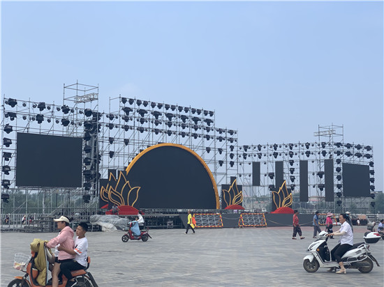 淮阳荷花节开幕式舞台在太昊陵广场广场造型完工。据悉,2020年7月10日晚8点在此开幕,同时在舞台东侧的龙湖上将上演全息水幕灯光秀。