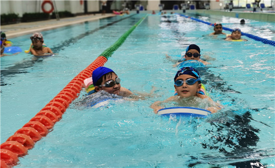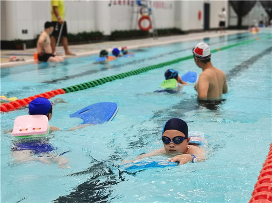 7月9日,不少孩子们在游泳馆内游泳嬉戏。暑假开始了,孩子们开始了丰富多彩的假期生活,有不少孩子来到游泳馆,在碧水中游戈,快乐健身。许多家长认为,游泳除了可以让孩子健身、消暑外,还能提高孩子的自救能力。
