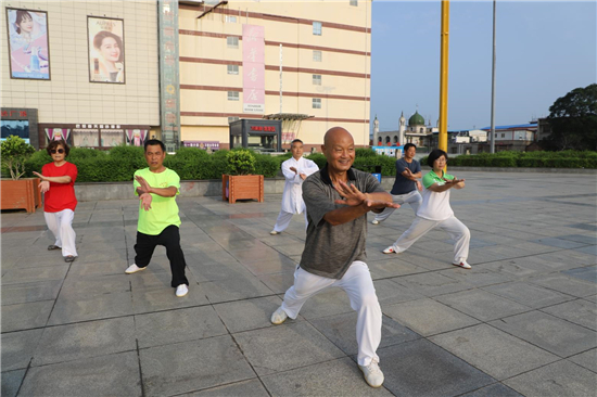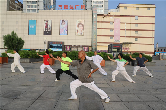 冬练三九,夏练三伏,练出一身真功夫。投伏第一天,周口市武术协会会长张志民带领会员在五一文化广场习练新编和氏26式太极拳。记者 王凯 摄