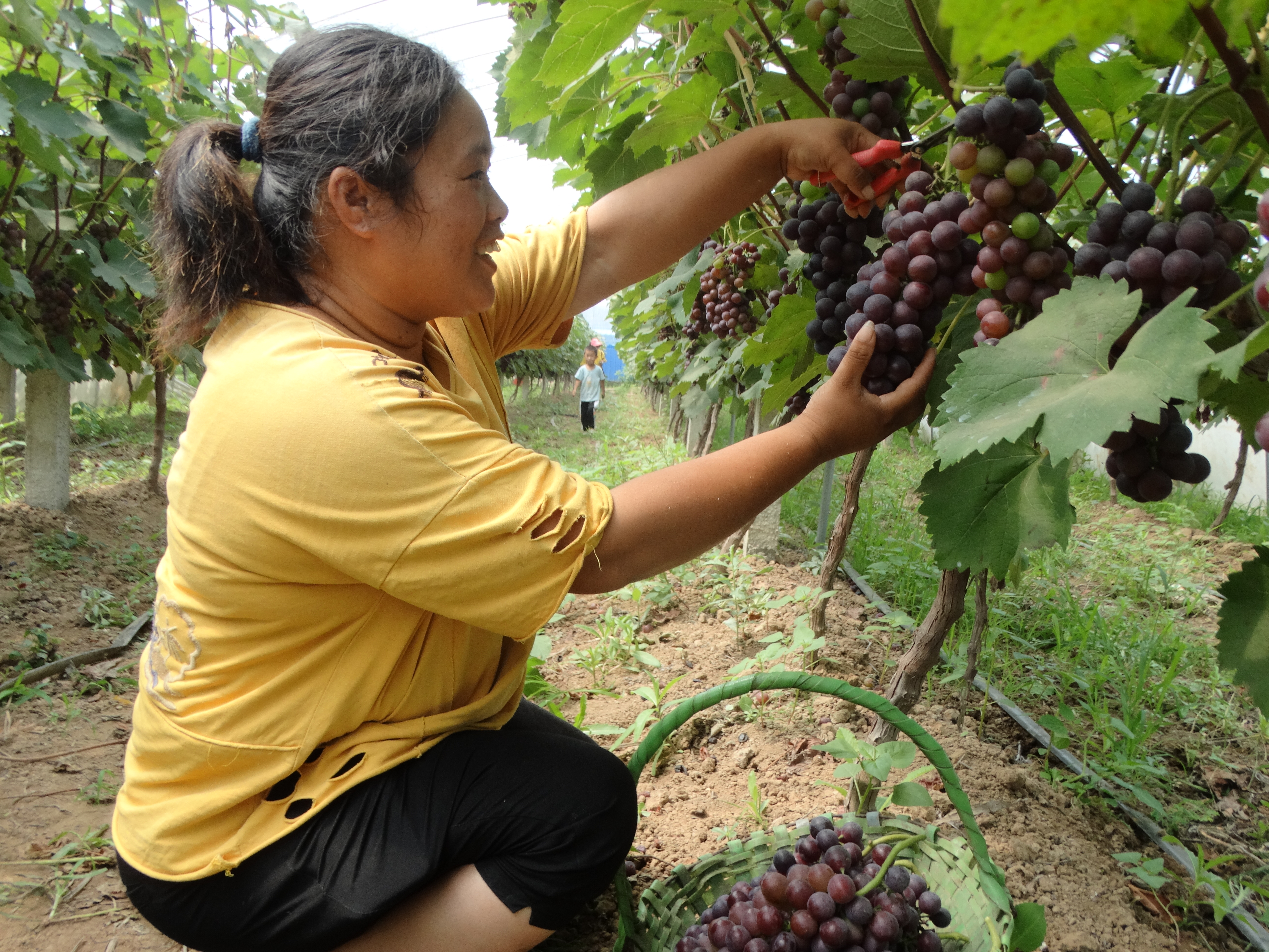 7月20日,沈丘县周营镇王寨村返乡农民工王红兵创办的大棚生态葡萄采摘园基地内,当地不少群众在体验休闲采摘葡萄、拍视频的乐趣。