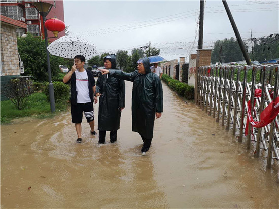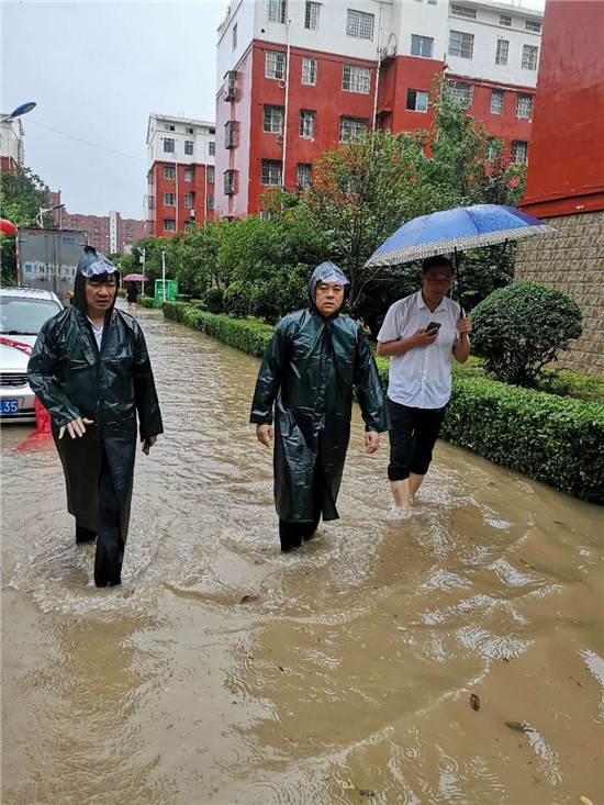 在未来家园小区,孙红伟一行涉水仔细查看小区积水情况。由于强降雨造成小区积水严重,居民出行困难,孙红伟当即安排李埠口乡负责人尽快组织人员设备排出积水,确保群众生命财产安全。