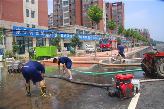 为加快排水速度,港区在汇林大道增设一个临时提泵站,以每小时1200立方米的速度,开足马力,全天排水。同时,安排工作人员24小时值班,紧盯排水动态,及时清除泵站格栅垃圾,将雨水顺利排至沙颍河,减少道路雨水负载量。针对社区和道路积水情况,各职能部门调集全部可调动的潜水泵,迅速排出社区和道路积水。
