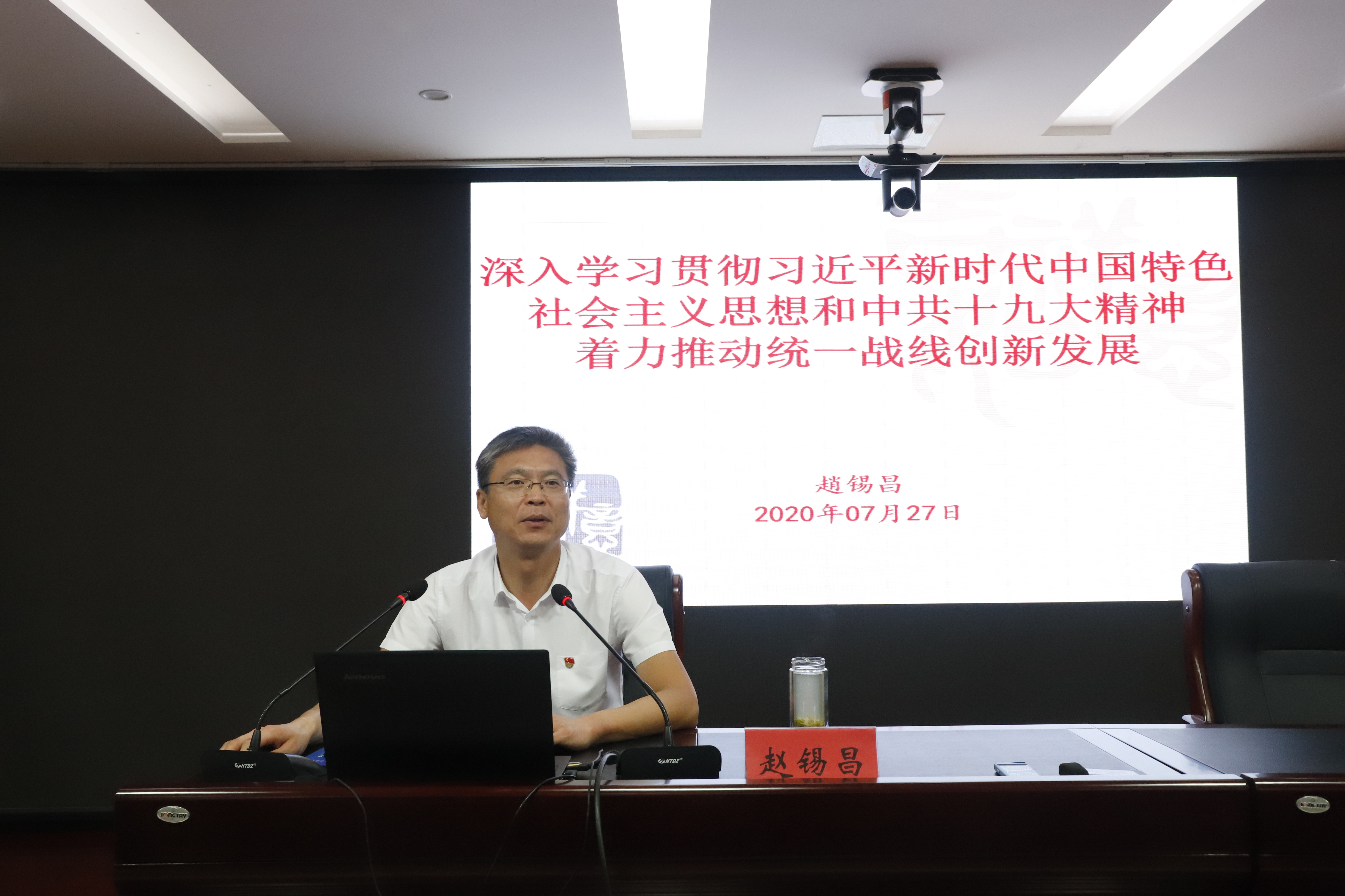 赵锡昌以《深入学习贯彻习近平新时代中国特色社会主义思想和中共十九大精神着力推动统一战线创新发展》为题,围绕新时代统一战线的定位、新时代统一战线的要求、新时代统一战线的任务、新时代统战工作的方法等四个方面,就统一战线的性质、主题、功能、方针、工作方法、对象范围和中央对统战工作的要求等重点内容,为参训党员干部了一堂生动的理论知识辅导课。