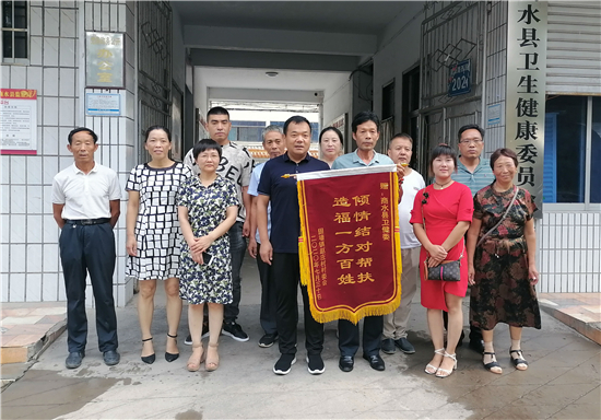 8月6日上午,商水县卫健委机关大门口,商水县固墙镇赵庄村党支部书记赵西灵带领村两委班子,专程到县卫健委赠送一面“倾情结对帮扶 造福一方百姓”的锦旗,代表全村近两千名村民表达对县卫健委的感激之情。