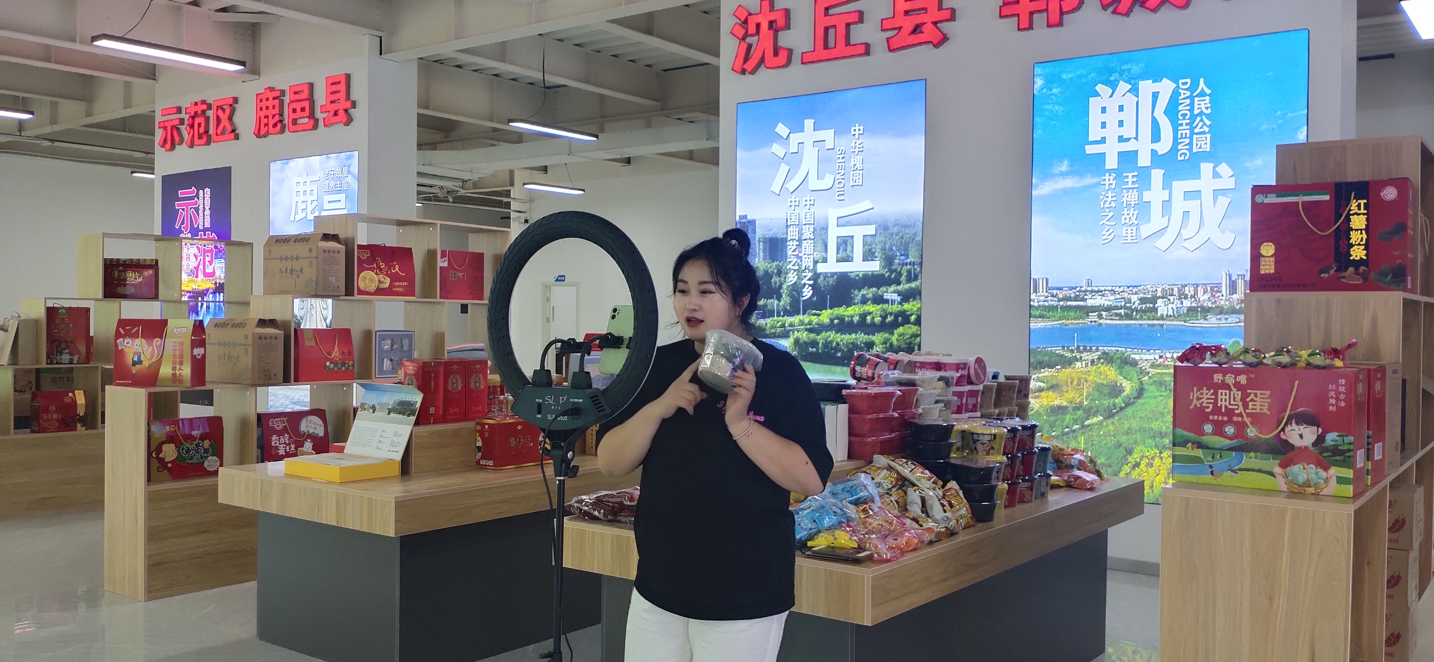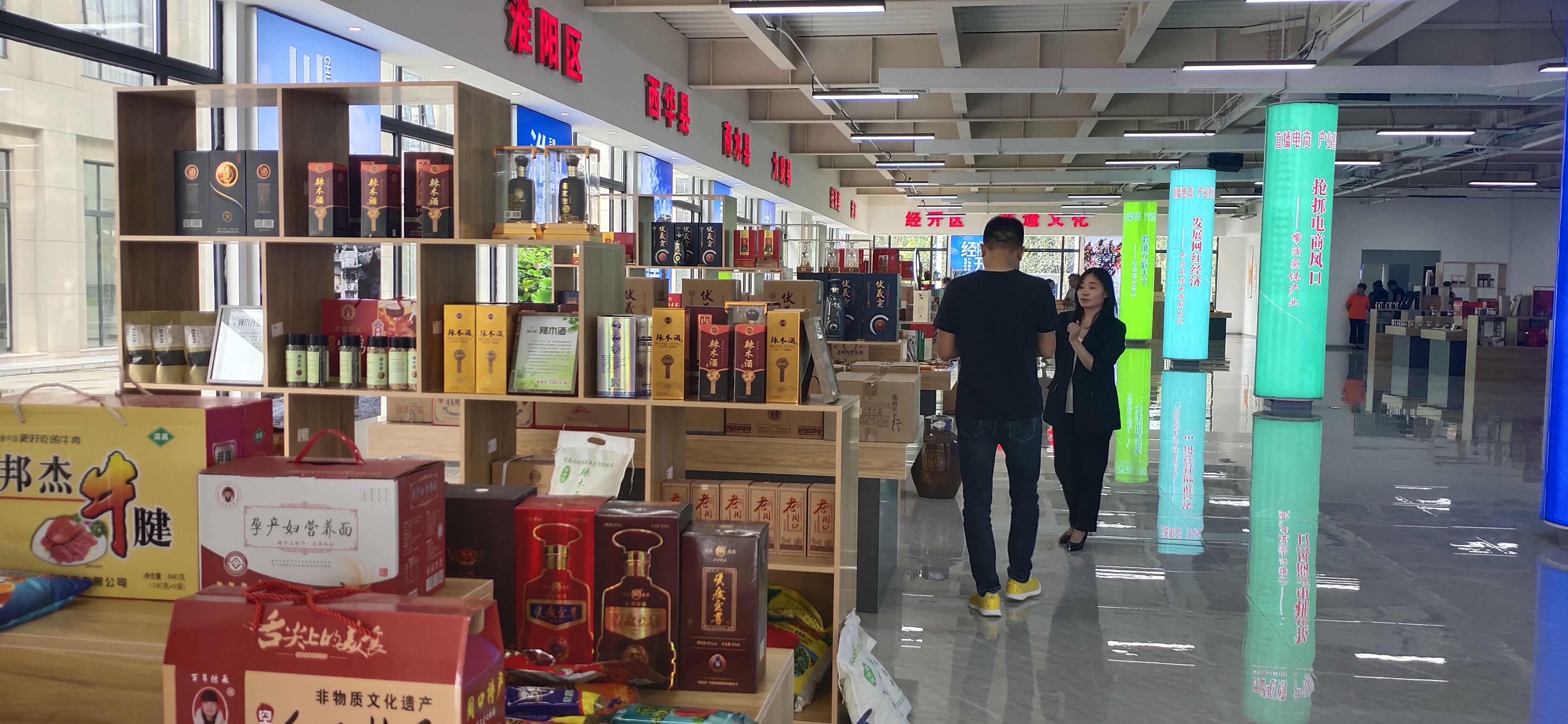 中心展厅面积达1000多平方米,按照不同县(市、区)划分为十几个区域,集中展示邦杰牛肉、伏羲贡酒、邓城猪蹄、汝阳刘毛笔、三川豫龙复合肥等周口产品。这些产品都是来自各县(市、区)等地农工副土特产品以及非遗产品。“我们将通过抖音、快手等视频平台,把这些产品销往全国各地。” 该基地负责人、周口东方会展商会会长于海岗说。