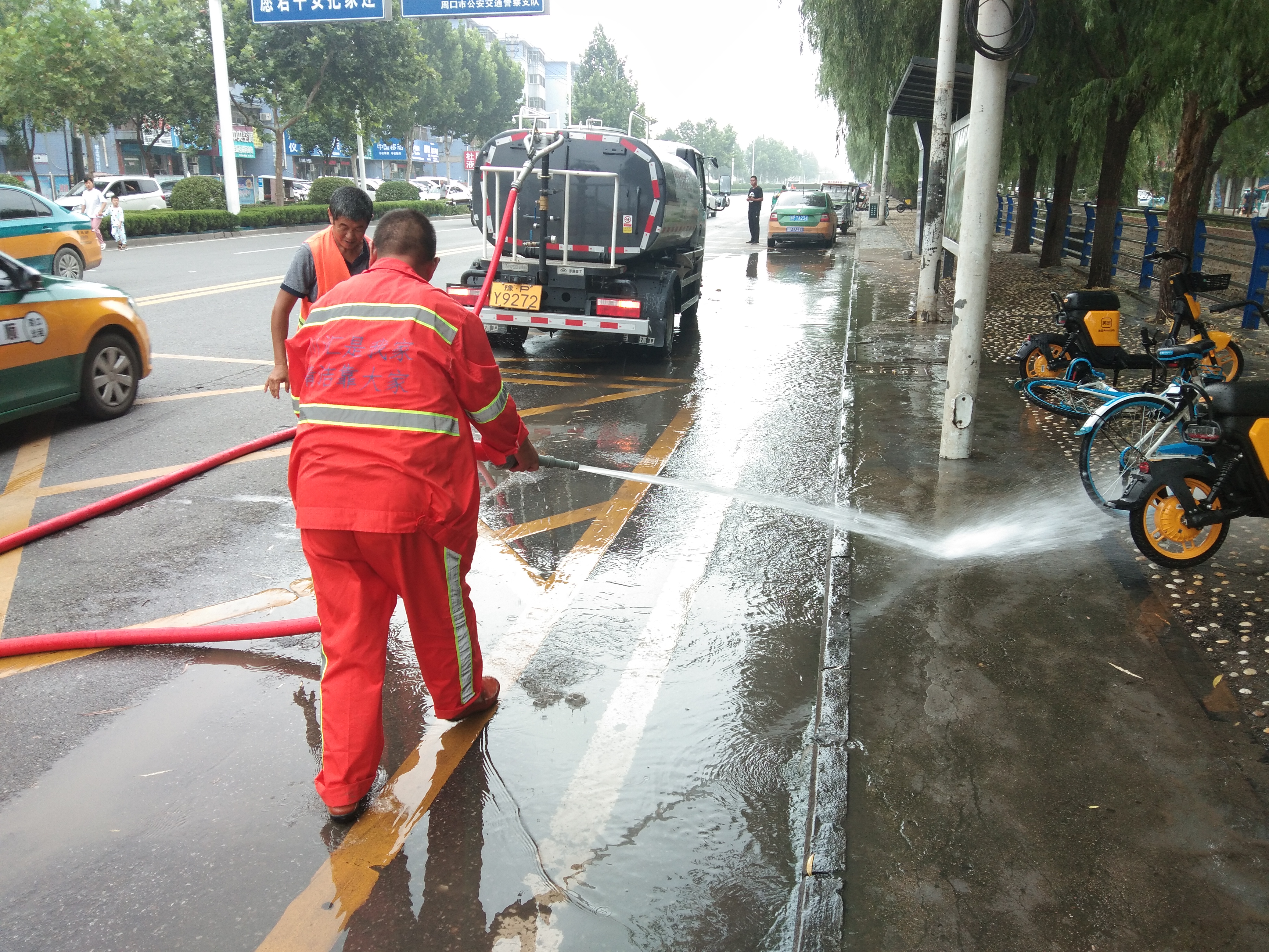 8月23日上午,记者在周口中心城区大庆路与交通大道交叉口附近看到,工作人员正在对一些人工难以清扫干净的路面进行高压冲洗作业,为“创卫”贡献力量,让市民有一个良好出行环境。