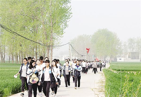 2018年春天,陈州高中组织高一学生进行了一场励志远足活动,学生在老师的带领下,从学校出发,穿过田野,徒步10公里,到达淮阳城区东侧的古城遗址平粮台。参观过平粮台后,师生稍作休息,又徒步原路返回。有的学生脚底板磨破了,在老师和同学的搀扶下,硬是咬牙坚持完成了这场远足活动。