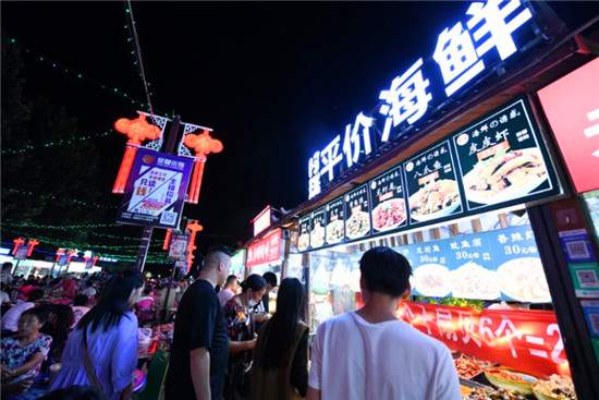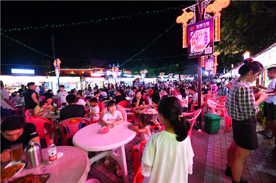 这里云集着全国各地的风味小吃,成为广大市民休闲消暑的打卡地、网红地,也成了附近居民创业、就业的基地。尤其是为推进“创卫”工作,开发区对这个夜市进行高标准持续打造,努力提升广场夜市的经营条件和周边环境,对各摊点的硬件设施规范提升。根据有关标准和管理需求,开发区协调有关部门,为夜市配备了治安民警、社区网格员、城管队员、市场监督员、卫生监督员、市场保洁员。城管部门根据实际情况,为南广场规范停车场地,净化外部环境,同时严格禁止超越夜市场所范围经营,不断提升周边环境。区市场监督管理分局根据实际情况,对各家餐饮经营摊点的员工进行统一培训,协助办理餐饮经营许可证,同时要求所有工作人员持健康证上岗。根据餐饮业经营规范的要求,区市场监督管理分局对各摊点的内部设施进行逐家验收,严格把关,协助规范整改,从而形成了良好的餐饮卫生环境。新冠肺炎疫情防控进入常态化阶段以后,开发区敏锐地抓住契机,迅速推进复产复工,在做好疫情防控规范的同时,积极推进南广场夜市恢复营业。3月17日,南广场夜市恢复营业后,迅速形成火爆场景。