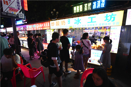 海鲜烧烤、螺蛳粉、米线、拉面、刀削面、汤包蛋酒、热干面、鸭脖子、煎扒鱼、干烧鲶鱼、油焖大虾、生煎包、红烧虾球、豆腐花……狭窄的街道上,摆满了简易的各式圆桌和凳子,琳琅满目的各种小吃摆在敞开排列的货架上,一目了然。顾客随意选择自由搭配,各种小吃让人胃口大开。劳累之余的人们津津有味地吃着小吃,喝着饮料……