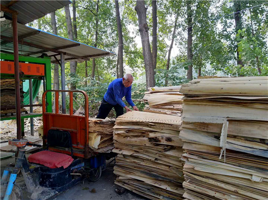 8月28日,商水县练集镇马庄村的四红木业有限公司板材加工车间内,机器轰鸣,工人忙着断木、打圆、卷板,一张张板材被切割后,拉到晒板场晾晒。“有了这份收入,去年全家脱贫摘帽。”正在车间里搬运板材的马庄村贫困户王天林对记者说。