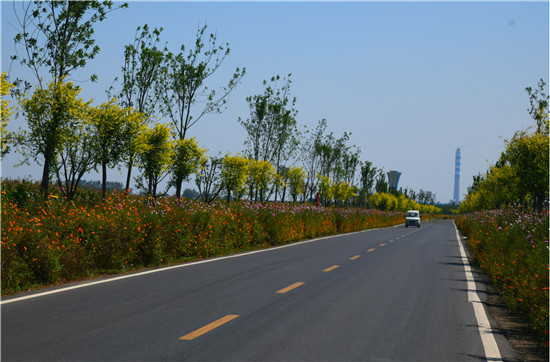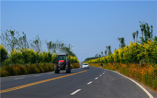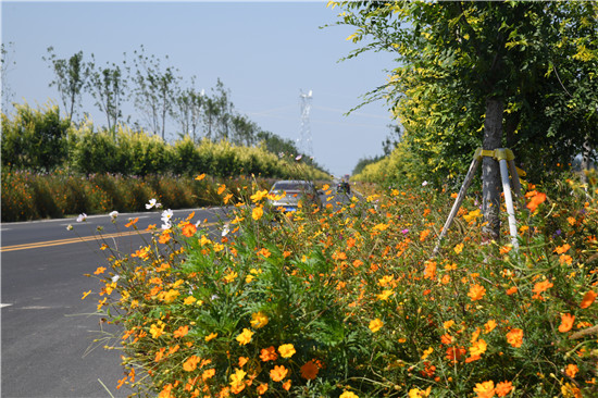 9月2日,富裕起来的农民驾车行驶在商水县高标准农田示范区内两侧开满鲜花的田间道路上。秋天到来,5万亩示范区内纵横交叉的近20公里田间道路两侧混种的格桑花、波斯菊、百日草等在灿烂的阳光下争奇斗艳,与长势喜人、丰收在望的秋作物相映成辉,引来许多市民前来观赏。记者付永奇摄