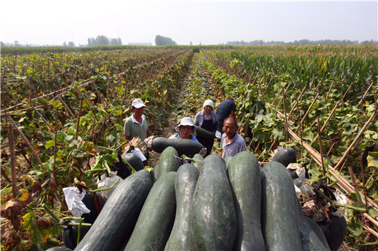 9月2日,在商水县袁老乡李庄村冬瓜种植基地,瓜农们正在采摘黑皮冬瓜装车外运。