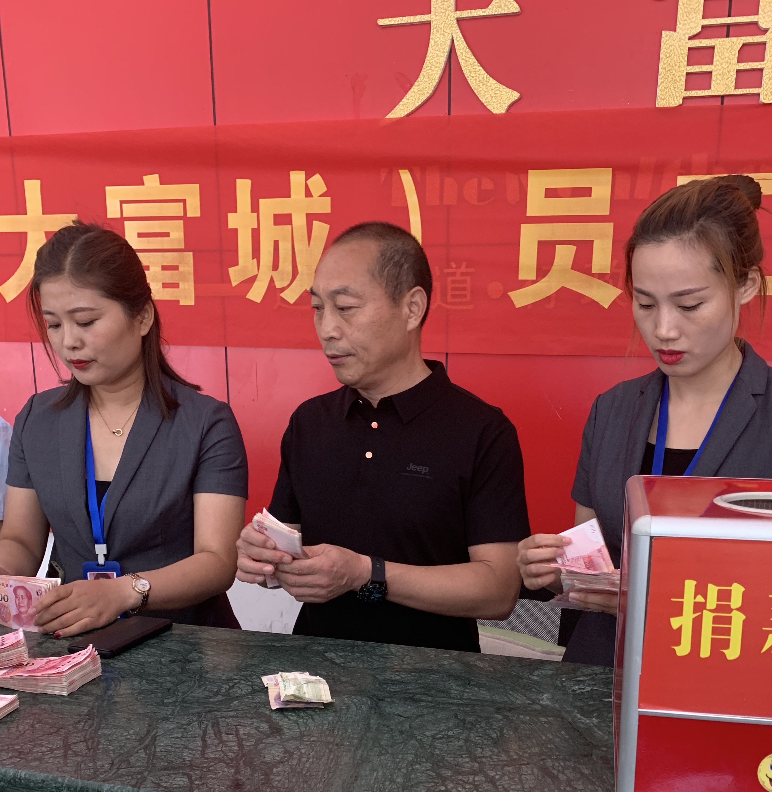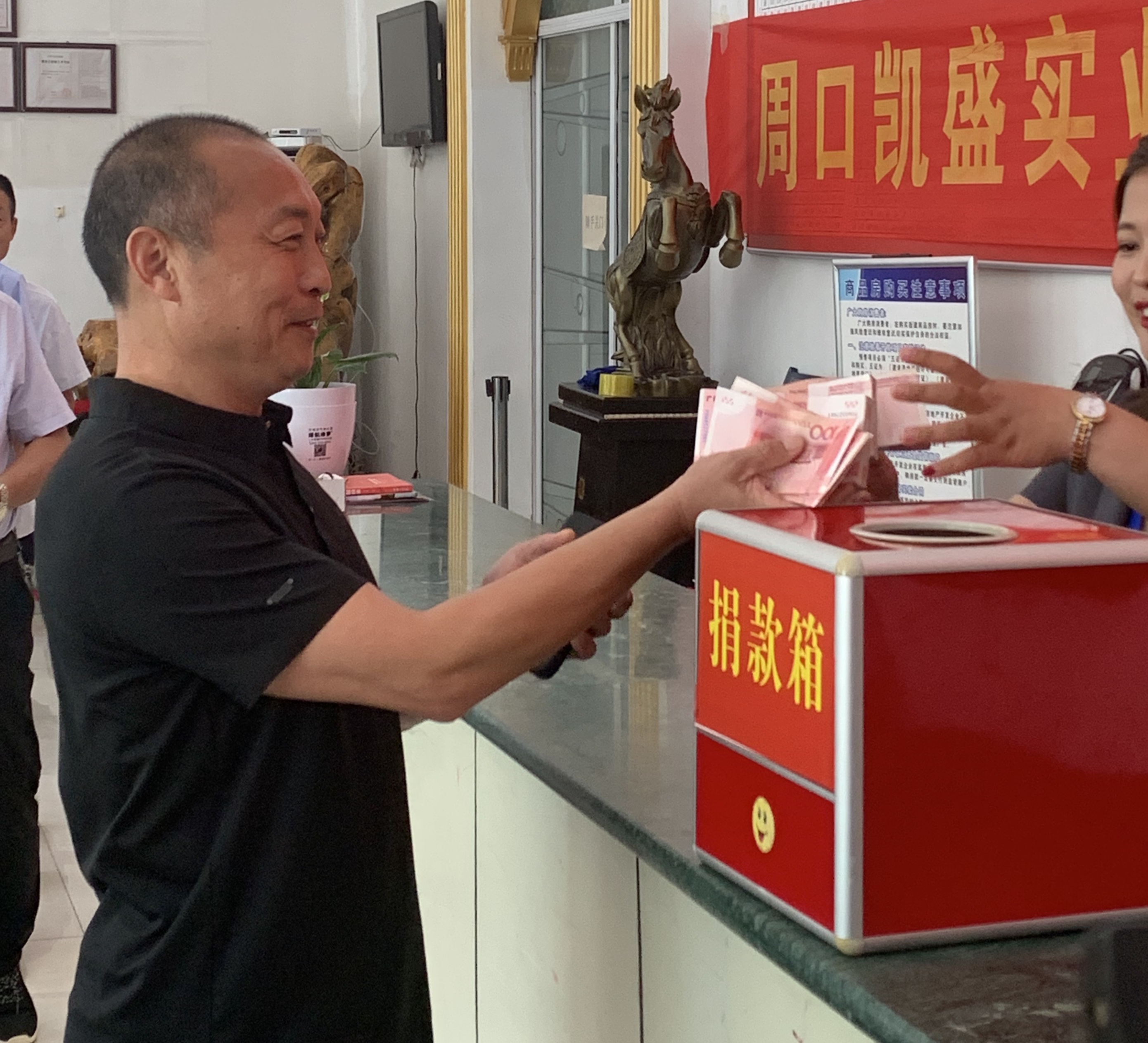 9月4日一大早,方凯带领41名员工在西华县大富城设立的捐款处为朱亚萍家进行捐款。