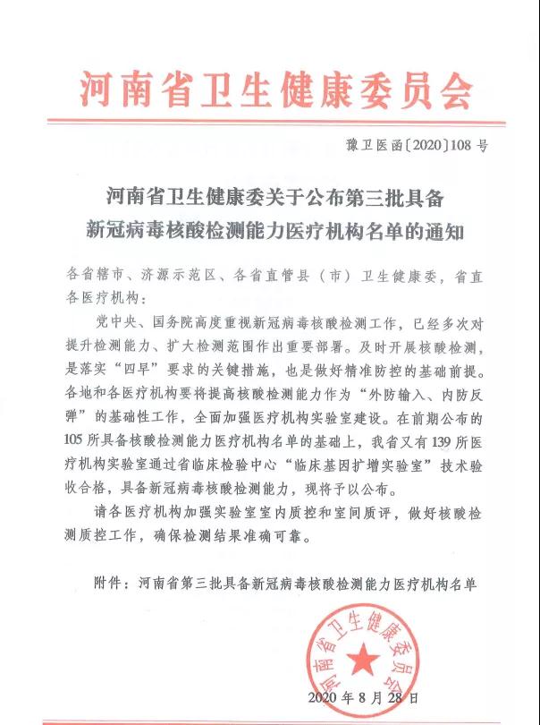 近日,郸城县妇幼保健院PCR核酸检测实验室通过了河南省临床检验中心的室间质量评价和实验室二级生物安全备案,已具备新冠病毒核酸检测能力,可承担新冠病毒核酸检测工作。目前,各高校正在陆续开学,但新冠疫情仍未完全控制,按照疫情防控要求,报到学生需进行一次核酸检测,持报告单入学报到。郸城县妇幼保健院作为河南省卫生健康委员会批准的新冠核酸检测机构,积极承担社会责任,按照“应检尽检,愿检尽检”的原则,已经于2020年9月1日起正式开展新冠病毒核酸检测工作,希望广大学子及有检测需要的人员,本着对自己负责、对家庭负责、对社会负责的原则,积极检测,为疫情防控工作贡献力量。