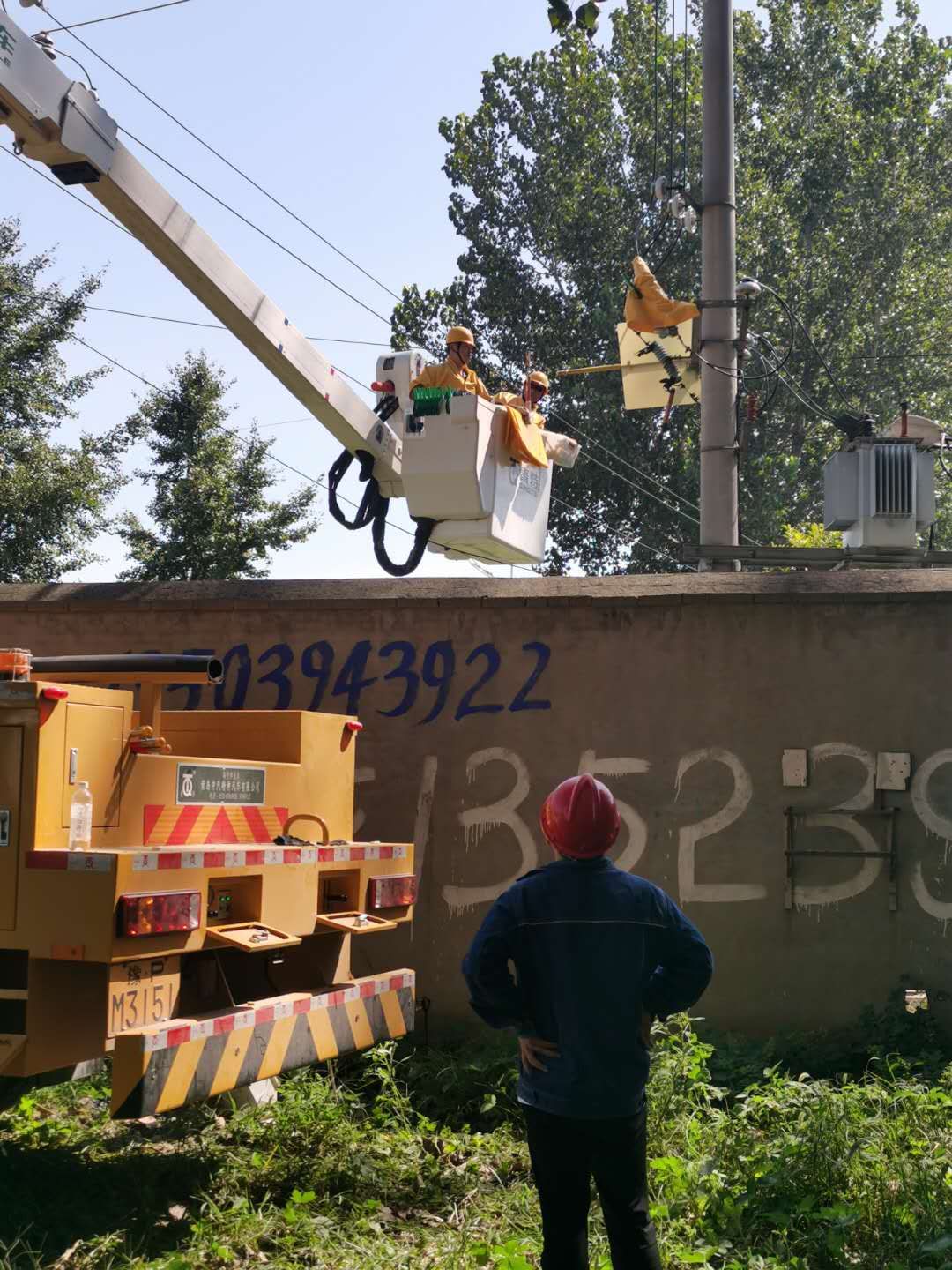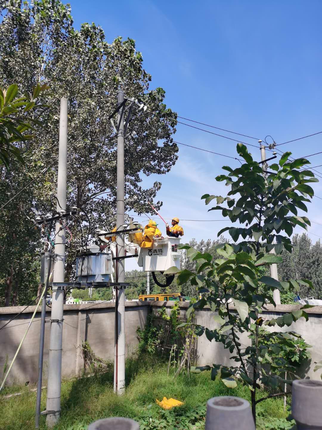 9月5日中午,“秋老虎”发威,燠热难耐。国网西华县供电公司城关供电所工作人员穿着长袖工作服,头戴安全帽,冒酷暑进行高空抢修作业。