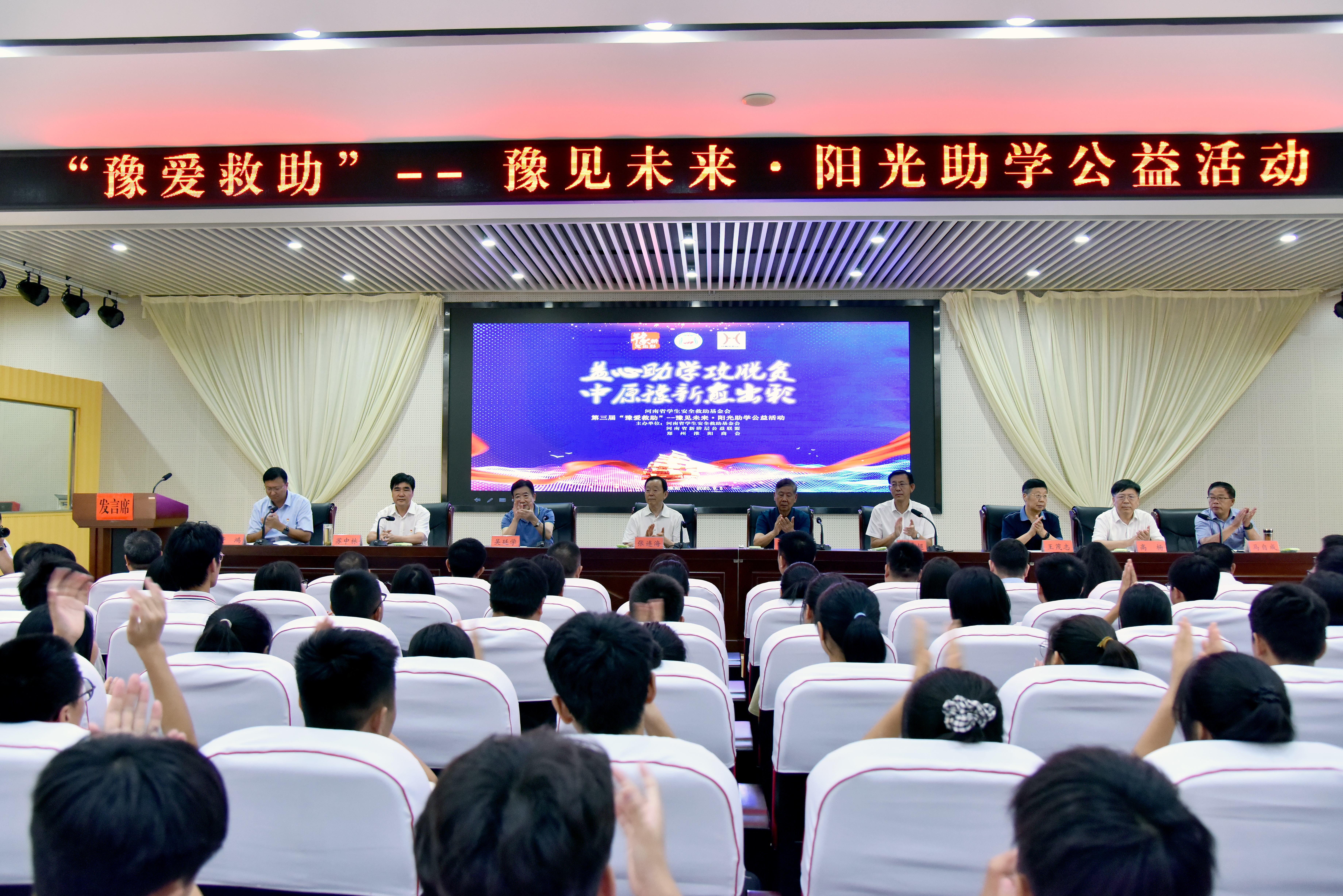 9月5日,河南省学生安全救助基金会、河南省新阶层公益联盟、郑州淮阳商会共同 主办的第三届“豫爱救助”—豫见未来·阳光助学公益活动在区教体局9楼会议室举行,30名贫困大学生获15万 元助学金。