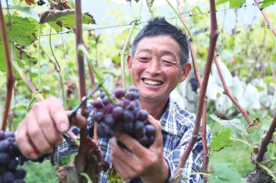 9月14日,汝阳县十八盘乡斜纹村冰墨葡萄种植专业合作社社员在葡萄园里采摘葡萄。斜纹村党支部积极引导村民种植冰墨葡萄130亩。该村通过发展优质高效农业,带动农民走上致富路。