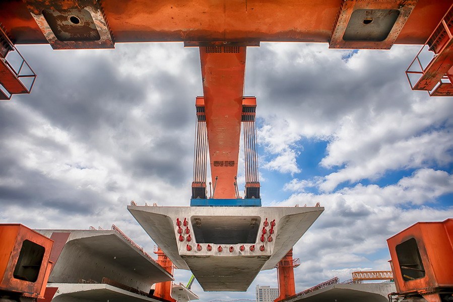 中铁四局四公司杭绍台铁路中心站特大桥工点,提梁机正在进行提梁作业。(郎成涛 摄)
