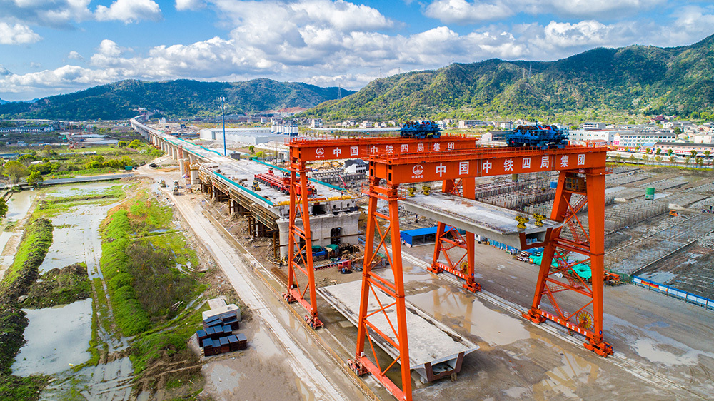 中铁四局四公司杭绍台铁路台州中心站特大桥架梁作业。(王晓龙 摄)