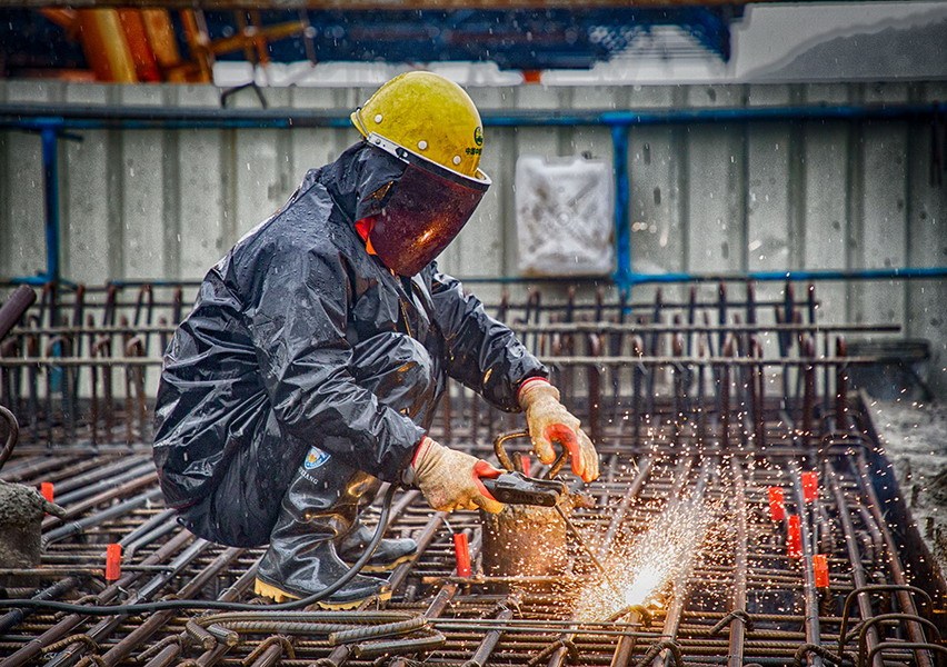 中铁四局四公司杭绍台铁路台州制梁场施工现场,工人正在冒雨焊接钢筋。(郎成涛 摄)