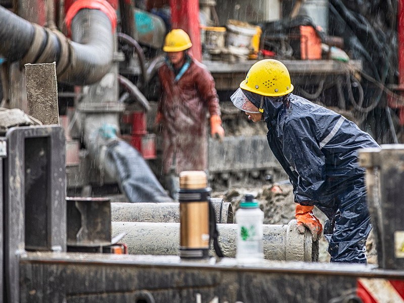 中铁四局四公司杭绍台铁路施工现场,工人冒雨施工作业(王晓龙 摄)