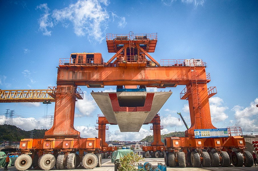中铁四局四公司杭绍台铁路施工现场,900吨运梁机正在运送箱梁。(郎成涛 摄)
