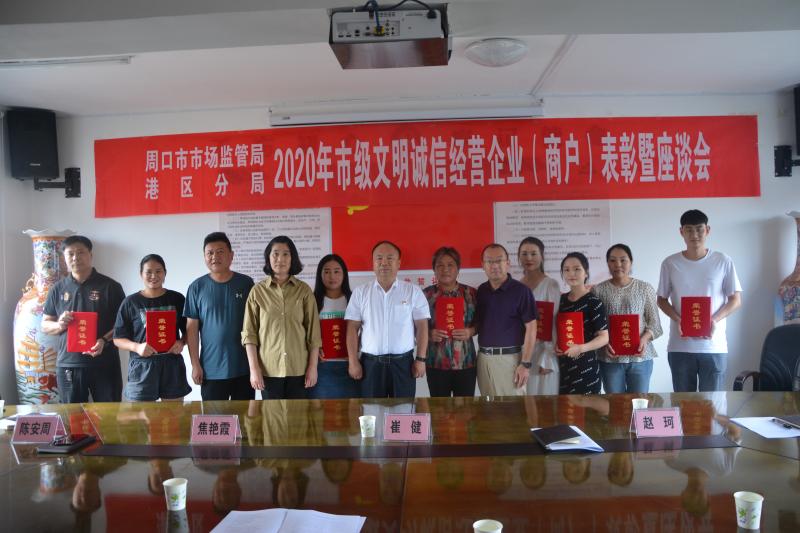 为进一步强化市场主体文明经营、诚信经营、合法经营的理念,助力全国文明城市提名城市创建工作,9月16日下午,周口市市场监管局港区分局召开表彰2019年度全市“文明诚信企业、文明诚信商户”暨座谈会,对辖区2家市级“文明诚信企业”和8家市级“文明诚信商户”进行表彰。