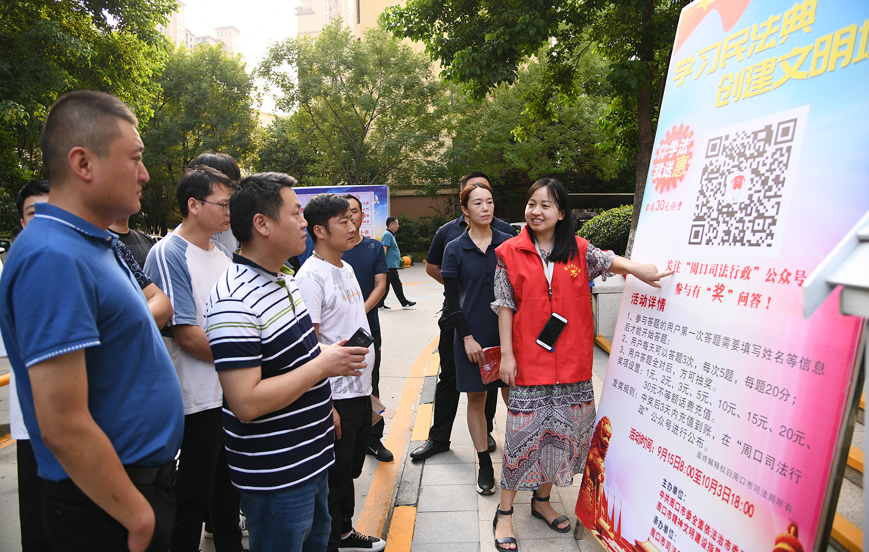 周口日报·新周口客户端 我国于今年5月份颁布的《民法典》是一部被誉为“社会生活的百科全书”的法律,涉及民生诸多方面。近日,市司法部门深入社区,以学法有奖形式,宣传这部和老百姓生活密切相关的法律。图为市司法部门工作人员在建业森林半岛社区宣传。记者 梁照曾 摄