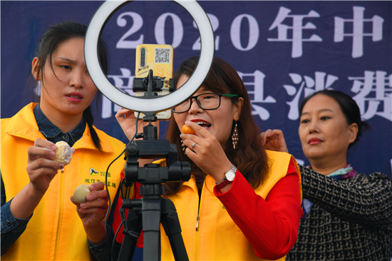 台上好戏连台,台下直播热闹非凡。在商水县商务局、县电商办的组织下,8家供应商通过网红直播带货为家乡产品代言,把本地的猪蹄、咸鸭蛋、牛肉、变蛋、黑色五谷等特色农产品销往全国各地,打开农产品销售新渠道,为农民脱贫致富奔小康增添新动能。据统计,当天上午丰收节开幕式期间,各商家两个小时里通过网红直播带货共下单686个,交易额42800元。
