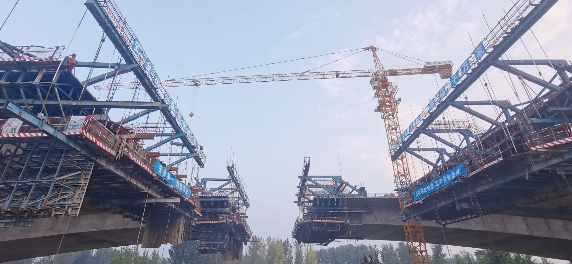 该桥东西两侧引桥采用40米预应力箱梁,全桥40米预制箱梁252片,东侧引桥梁板架设已全部完成正在进行桥面系施工,西侧引桥已架设半幅。主桥采用预应力变截面连续现浇梁,悬浇段共16个节段,采用四套菱形挂篮;左幅已施工至15号节段,即将开始合龙段施工;右幅已施工至12号节段。