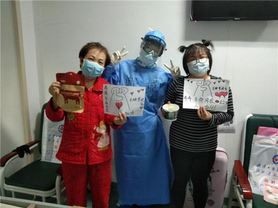 面对新冠肺炎重症病区患者心理压力普遍较大的情况,胡奔奔每天忙完护理工作之余,主动通过谈心、跳舞、做游戏等方式对患者进行心理疏导,成为大家的“开心果”,使得病区氛围大大改善,有了欢声笑语。三八节当天,她为病区患者送上亲手绘制的“奔奔与你同在”简笔画,以及家乡特产牛肉和胡辣汤,为患者加油。见到患者的笑容,成了胡奔奔最开心的事情。