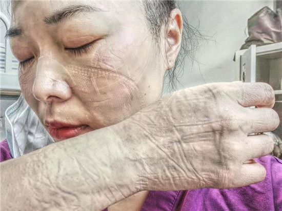 因为新冠肺炎的强传染性,胡奔奔每次去病区上班都要全副武装,而且为保证在6个小时的工作时间内不被暴露,不能去卫生间,不能喝水,还要穿上成人纸尿裤以防万一。这样下来,汗湿衣服是常事,而且下班后脱掉防护装备后,她原本清秀白皙的脸上,满是深深的皱褶,久久难以恢复,惹人心疼。给家人报平安时,胡奔奔甚至不敢视频聊天,只能语音安慰家人。