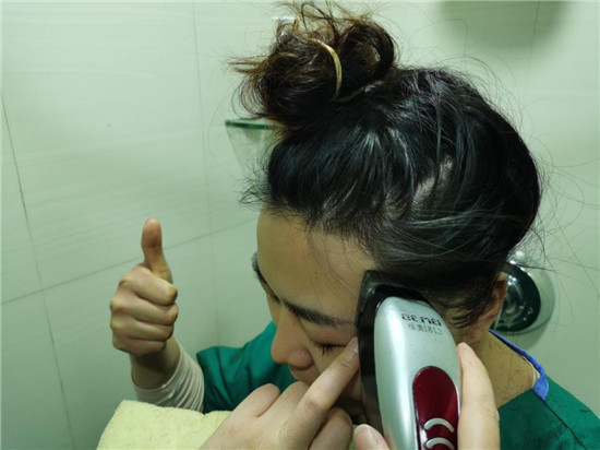 出征武汉之前,为减少感染自己、感染别人的风险,出生于1991年、和同龄人一样爱美的胡奔奔毅然决定同意剃去一袭披肩长发。这头秀发,胡奔奔留了多年,曾经看得跟生命一样珍贵,但疫情险恶,她义无反顾。