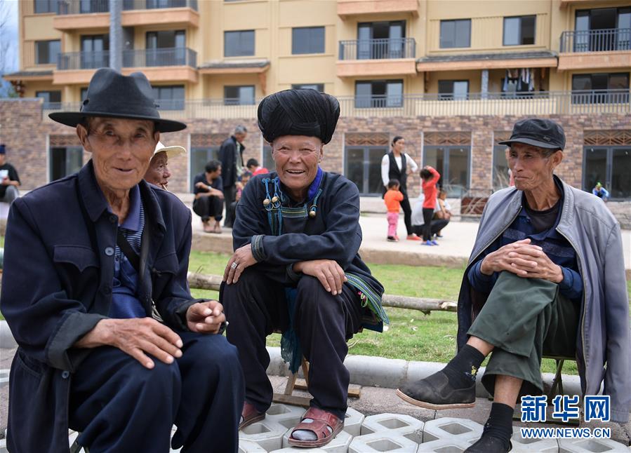 搬下山的人们,住进了有彝族传统建筑风格的新社区,老人们常聚在街边休闲(8月11日摄)。 新华社记者 李贺 摄