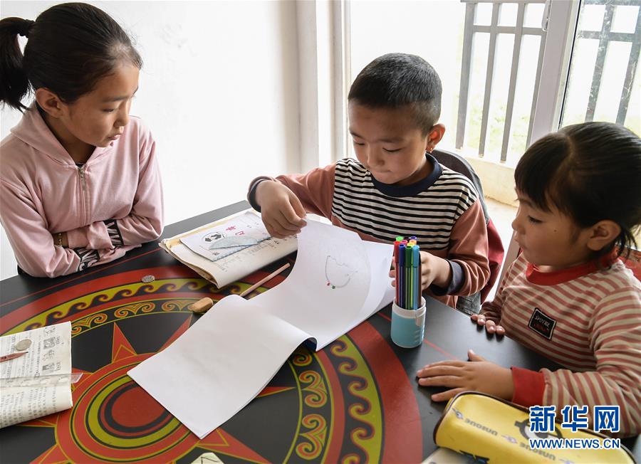 昭觉县城城郊集中安置点南坪社区内,一户彝族群众家中的孩子围坐在书桌旁画画(8月11日摄)。 新华社记者 李贺 摄