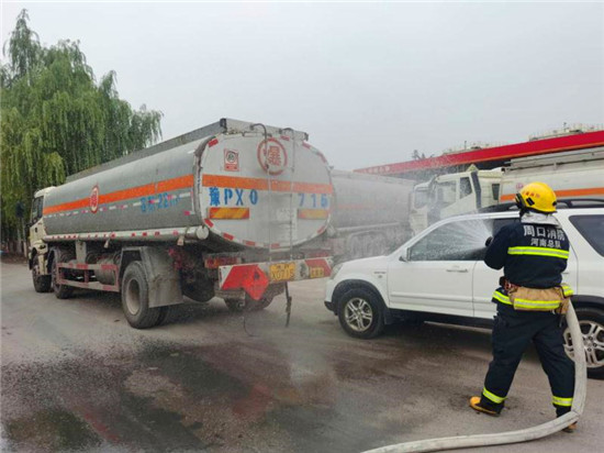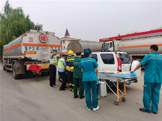 当日上午10时,商水交警大队指挥中心接到报警:在商水县兴商大道与陈胜大道交叉口西、汤庄油库处,一辆轿车与一辆危化品罐车追尾相撞,正常罐体损坏,危化品泄露起火,轿车驾驶室变形,驾驶人被困车内,如不及时救援,驾驶人有生命危险,另外因事故现场临近汤庄油库,如不及时处置可能发生爆炸,后果不堪设想。