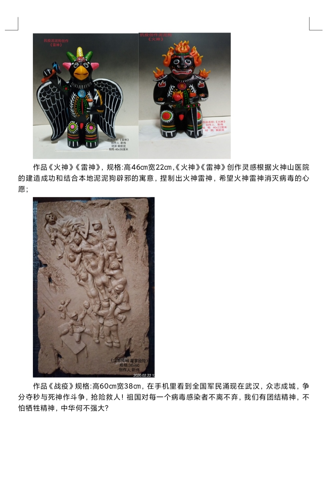 三大民俗展设计的艺术作品有汴绣、官瓷、烙画、泥塑、砖雕、蛋雕、布艺等,不仅体现了传统民间艺术的经典,也展示艺术家独具匠心的灵感。我市7名艺术家主要参与“打赢2020年疫情防控阻击战”民间工艺美术作品展,他们分别是张振幅、靳伟、张华伟、许述章、朱华英、谭海蓬、张瑞旭,参展的抗疫作品类型有泥塑、木板年画、面塑、葫芦烙画、剪纸等,展示周口艺术家“艺”心抗疫,用优秀的作品鼓舞全民抗疫士气、弘扬正能量。(③2)