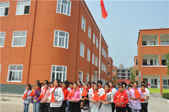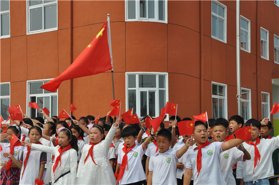 当日上午,800余名师生穿着节日的盛装、手拿鲜花和国旗进入操场。旗手到位后,全体少先队员面向国旗庄严宣誓:“我们是光荣的少先队员,我们是21世纪的中国少年……让星星火炬代代相传,让祖国明天更加繁荣富强。”