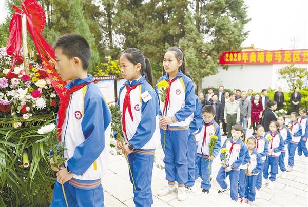 9月30日,云南省曲靖市马龙区在当地的马龙区烈士陵园举行公祭烈士活动,这是参加公祭活动的小学生排队献花。