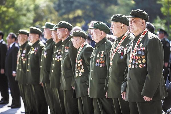 上图:9月30日,辽宁省暨沈阳市向烈士纪念碑敬献花篮仪式在沈阳抗美援朝烈士陵园举行,这是参加仪式的老战士代表在仪式中。