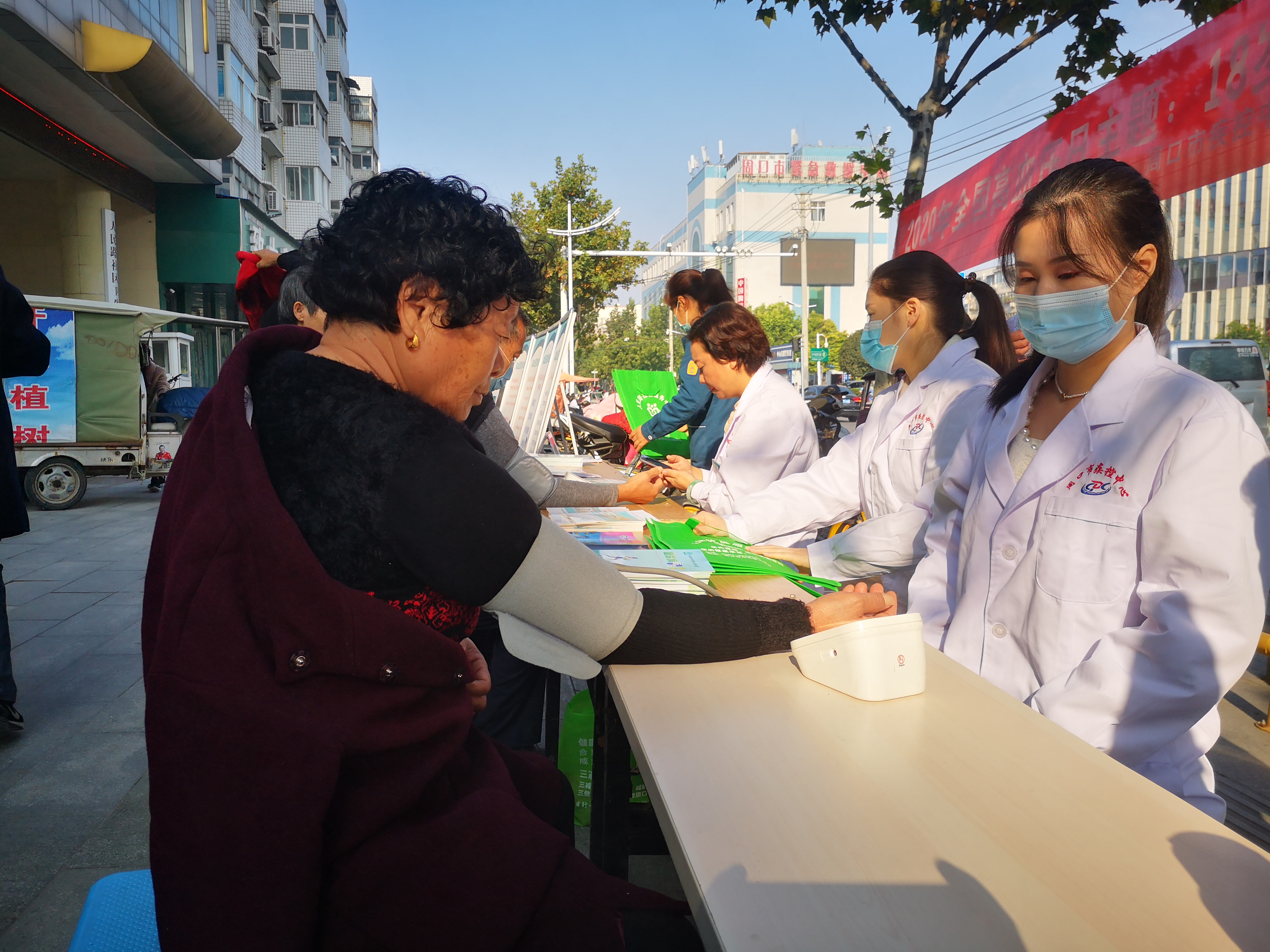 10月8日是第23个全国高血压日,周口巿疾控中心积极开展防治高血压科普知识宣传活动,在人民路东段设立咨询义诊台,为前来咨询的群众测量血压、血糖,向群众宣传“合理膳食,适量运动”“健康心率、健康血压”等知识。图为市疾控中心工作人员为过往群众测量血压。