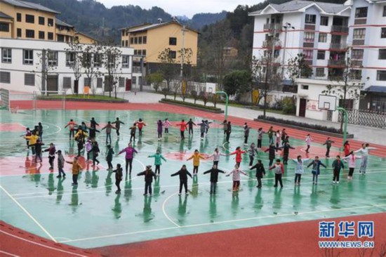 重庆市石柱土家族自治县中益乡小学的同学们在老师的带领下练习摆手舞(2020年1月10日摄)。 新华社记者 王全超 摄