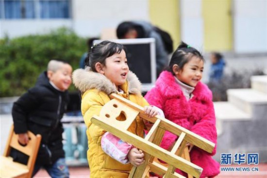 重庆市石柱土家族自治县中益乡小学的同学们搬着小椅子前往操场观看文艺表演。当日,“我的中国梦——文化进万家”中国视协文艺志愿服务小分队走进中益乡小学,为师生们带来精彩的文艺表演(2019年12月12日摄)。新华社记者王全超 摄