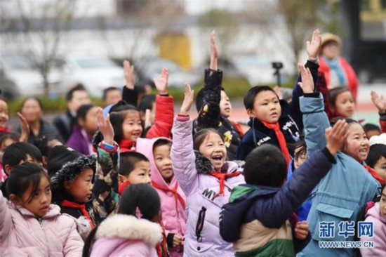 重庆市石柱土家族自治县中益乡小学的同学们在文艺演出现场与演员互动。当日,“我的中国梦——文化进万家”中国视协文艺志愿服务小分队走进中益乡小学,为师生们带来精彩的文艺表演(2019年12月12日摄)。新华社记者王全超 摄