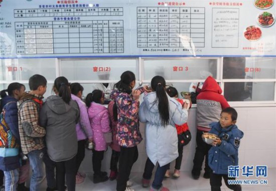 重庆市石柱土家族自治县中益乡小学学生在食堂排队打饭菜(2020年1月10日摄)。 新华社记者 王全超 摄