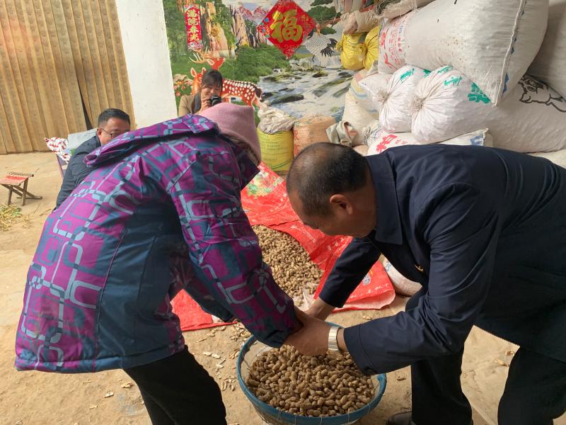 老人看身边的几个来看望她的人一直在那站着,心里很不是滋味,就急忙在花生堆里拣出来一些饱满的花生,双手捧着让他们吃花生,谁不吃花生她都不依。一时间,这个农家院里充满着阵阵笑声。