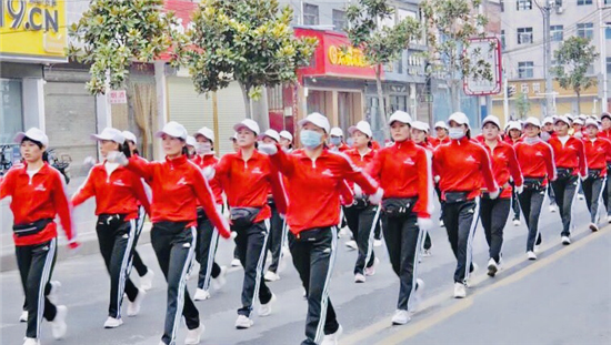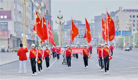 10月11日早晨,郸城大街上迎来了一道靓丽的风景线——他们身着鲜艳的红色运动服,肩扛五星红旗,手扯横幅,随着动感十足的音乐,昂首阔步徜徉在金色的秋天里……