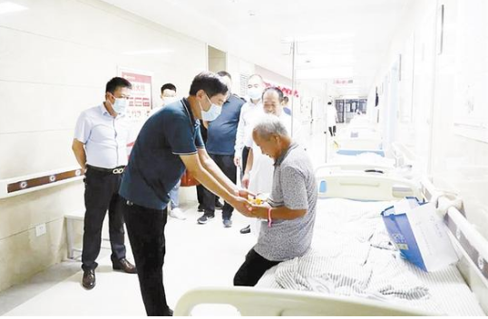 “双节”当天,郸城县第二医健集团县中医院院长水新华,副院长史昊、仵好金、崔冬一行分别到临床、医技等科室慰问节日值班人员和住院患者,转达了郸城县卫健委党组书记、主任付登霄对大家的节日祝福,并向“援鄂英雄”胡奔奔送去节日慰问,向住院患者送去月饼和祝福。记者 徐松 通讯员 张洋 摄